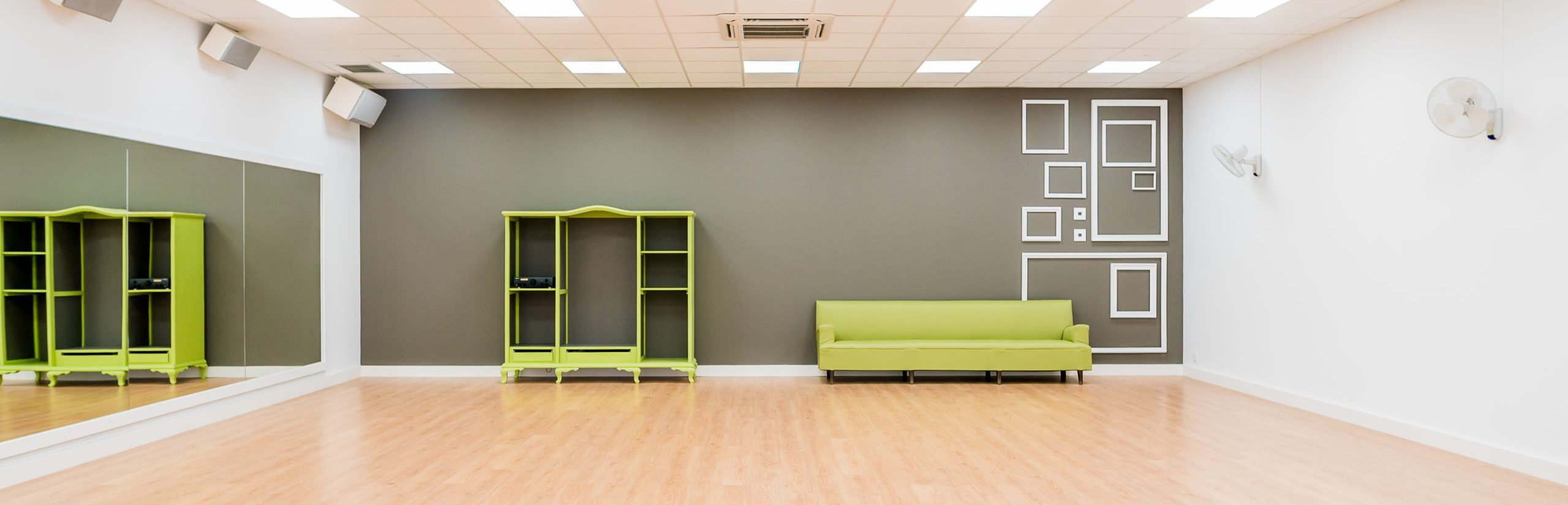 2 Amplias salas perfectamente acondicionadas, vestuarios, y una zona de cafetería. Con parking gratuitos, paradas de bus y tren a 1 minuto.